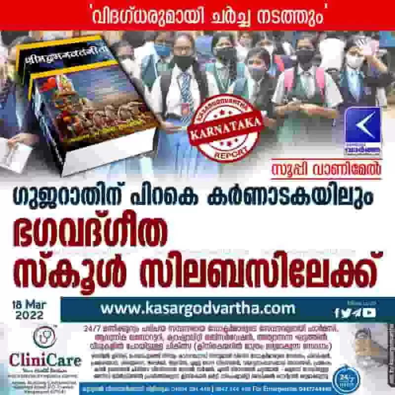മംഗ്ളുറു : (www.kasargodvartha.com 18.03.2022) ആറു മുതൽ 12 വരെ ക്ലാസുകളിൽ ഭഗവത്ഗീത പഠനം നിർബന്ധമാക്കുമെന്ന് വ്യാഴാഴ്ച ഗുജറാത്ത് സർകാർ പ്രഖ്യാപിച്ചതിന്റെ ചുവടുപിടിച്ച് കർണാടക സർകാറും ഒരുങ്ങുന്നു. ഈ ആശയം കർണാടക സിലബസനുസരിച്ച് പ്രവർത്തിക്കുന്ന സ്കൂളുകളിലും നടപ്പാക്കാൻ ഉദ്ദേശ്യമുണ്ടെന്ന് പ്രൈമറി-സെകന്‍ഡറി വിദ്യാഭ്യാസ മന്ത്രി ബി സി നാഗേഷ് വെള്ളിയാഴ്ച ബെംഗ്ളുറിൽ മാധ്യമപ്രവർത്തകരോട് പറഞ്ഞു.