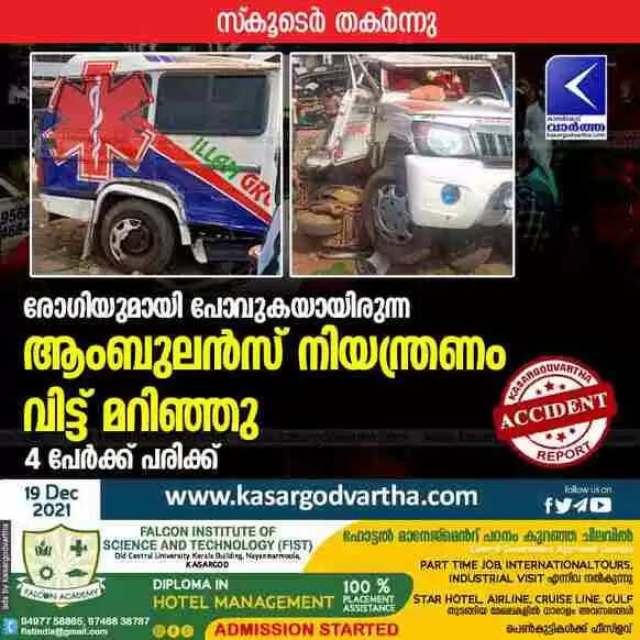 Keywords: News, Kerala, Top-Headlines, Accident, Ambulance, Injured, Uppala, Mangalore, Natives, Hospital, Kasaragod, Scooter, Pallathur, Ambulance overturns; 4 injured.