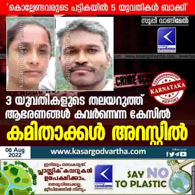 മംഗ്‌ളുറു: (www.kasargodvartha.com) മൂന്ന് യുവതികളുടെ തലകള്‍ അറുത്ത് ആഭരണങ്ങള്‍ കവര്‍ന്ന കമിതാക്കളെ പ്രത്യേക സംഘം അറസ്റ്റ് ചെയ്തതായി പൊലീസ്. ശ്രീരംഗപട്ടണം താലൂക് പരിധിയിലെ സിദ്ധലിംഗപ്പ (40), കാമുകി ചന്ദ്രകല(35) എന്നിവരാണ് അറസ്റ്റിലായതെന്ന് മാണ്ട്യ ജില്ലാ പൊലീസ് സൂപ്രണ്ട് ഓഫീസില്‍ വിളിച്ചു ചേര്‍ത്ത വാര്‍ത്താസമ്മേളനത്തില്‍ സതേണ്‍ റേന്‍ജ് ഐജി പ്രവീണ്‍ മധുകര്‍ പവാര്‍ അറിയിച്ചു. അടുത്ത് ജീവനെടുക്കേണ്ട അഞ്ച് യുവതികളുടെ പട്ടിക കമിതാക്കളുടെ കയ്യില്‍ ഉണ്ടായിരുന്നുവെന്ന് മാണ്ട്യ എസ് പി യതീഷ് 'കാസര്‍കോട് വാര്‍ത്ത'യോട് പറഞ്ഞു.