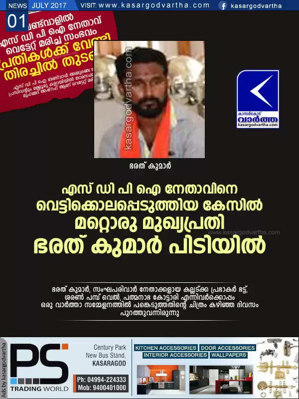 എസ് ഡി പി ഐ നേതാവിനെ വെട്ടിക്കൊലപ്പെടുത്തിയ കേസില് മറ്റൊരു മുഖ്യപ്രതി ഭരത് കുമാര് പിടിയില്