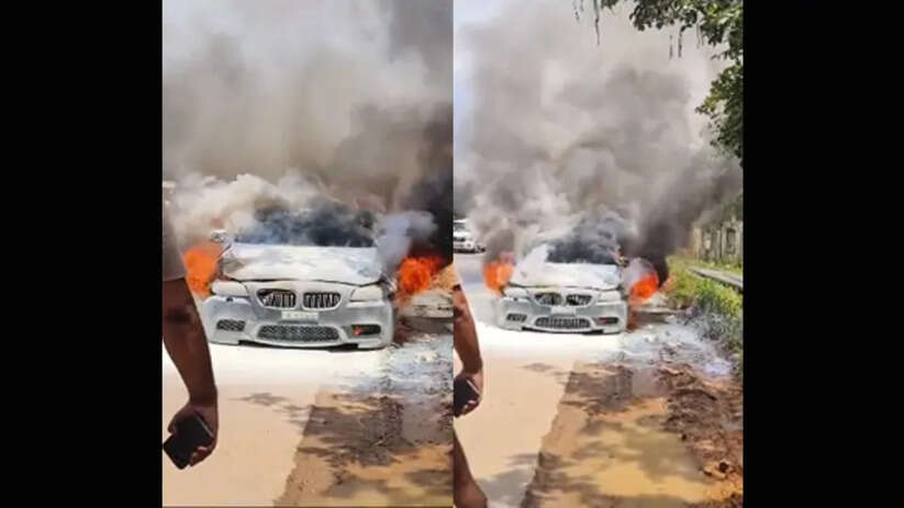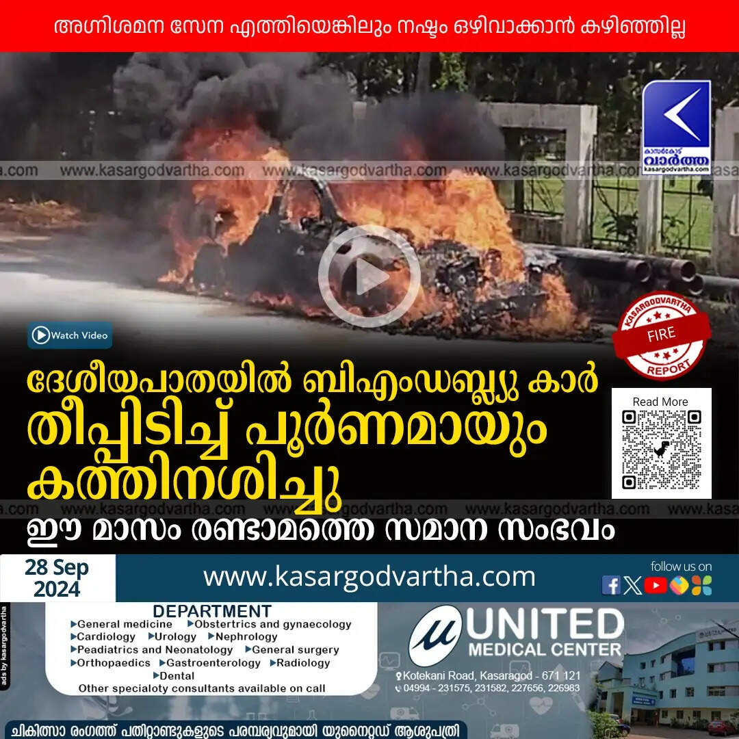Fire | ദേശീയപാതയിൽ ബിഎംഡബ്ല്യു കാർ തീപ്പിടിച്ച് പൂർണമായും കത്തിനശിച്ചു; ദൃശ്യങ്ങൾ; ഈ മാസം രണ്ടാമത്തെ സമാന സംഭവം