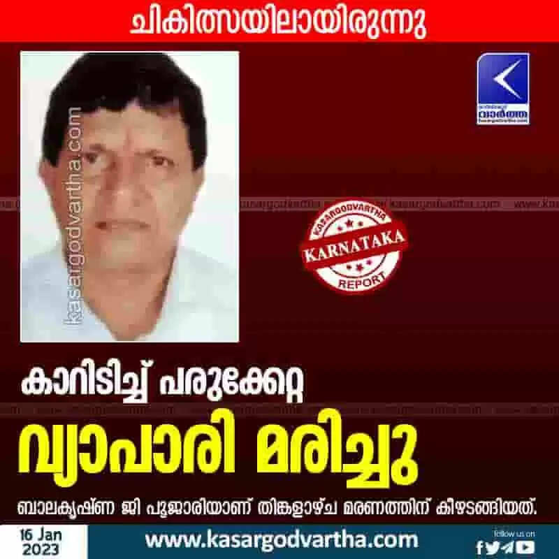 മംഗ്ളുറു: (www.kasargodvartha.com) ദേശീയ പാത 66ല് കൗപുവില് കാല്നടക്കിടെ കാറിടിച്ച് പരുക്കേറ്റ മുംബൈയിലെ വ്യാപാരി ഉഡുപിയില് ആശുപത്രിയില് മരിച്ചു. ബാലകൃഷ്ണ ജി പൂജാരിയാണ് (60) തിങ്കളാഴ്ച മരിച്ചത്.