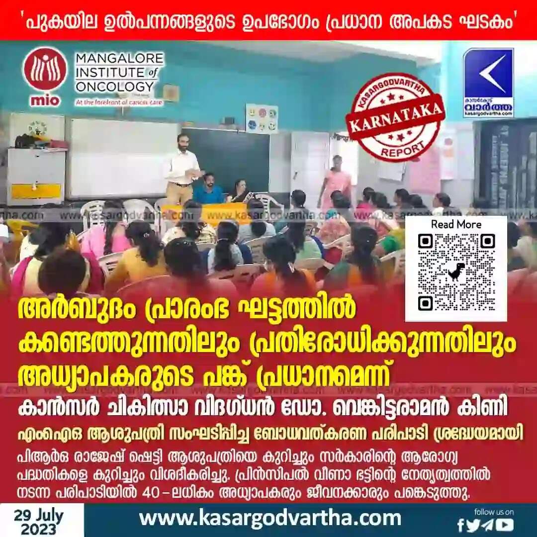 കാന്സര് വരാതെ സൂക്ഷിക്കേണ്ടത് വളരെ പ്രധാനമാണ്. കാന്സറിനെ കുറിച്ച് അധ്യാപകരെ ബോധവാന്മാരാക്കുകയും അതുവഴി കുട്ടികളുടെ രക്ഷിതാക്കള്ക്കും സമൂഹത്തിനും ഈ വിഷയത്തില് ശരിയായ മാര്ഗം കാണിച്ചുകൊടുക്കുന്നതിന് വിവരങ്ങള് നല്കുകയും ചെയ്യേണ്ടത് വളരെ പ്രധാനമാണെന്നും ഡോ. വെങ്കിട്ടരാമന് കിണി കൂട്ടിച്ചേര്ത്തു. മംഗ്ളുറു ഇന്സ്റ്റിറ്റിയൂട് ഓഫ് ഓങ്കോളജി അധ്യാപകര്ക്കായി തുടര്ച്ചയായ പരിപാടികള് നടത്തിവരികയാണെന്നും അദ്ദേഹം പറഞ്ഞു.