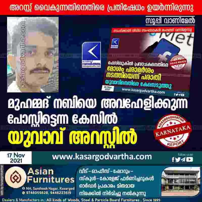 മംഗ്ളുറു: (www.kasargodvartha.com 17.11.2021) മുഹമ്മദ് നബിയെ അവഹേളിക്കുന്ന പരാമർശങ്ങളോടെ ഫെയ്സ്ബുക് പോസ്റ്റിട്ടു എന്ന കേസിൽ യുവാവിനെ പൊലീസ് അറസ്റ്റ് ചെയ്തു.