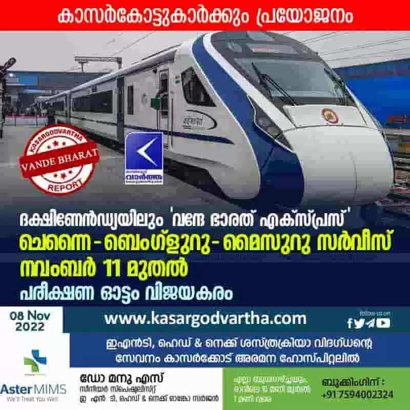 Vande Bharat | ദക്ഷിണേൻഡ്യയിലും 'വന്ദേ ഭാരത് എക്‌സ്പ്രസ്'; ചെന്നൈ-ബെംഗ്ളുറു-മൈസുറു സർവീസ് നവംബർ 11 മുതൽ; പരീക്ഷണ ഓട്ടം വിജയകരം; കാസർകോട്ടുകാർക്കും പ്രയോജനം
