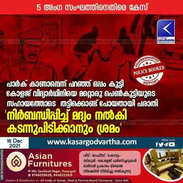 പാർക് കാണാനെന്ന് പറഞ്ഞ് ഒപ്പം കൂട്ടി കോളജ് വിദ്യാർഥിനിയെ മറ്റൊരു പെൺകുട്ടിയുടെ സഹായത്തോടെ തട്ടിക്കൊണ്ട് പോയതായി പരാതി; 'നിർബന്ധിപ്പിച്ച് മദ്യം നൽകി; കടന്നുപിടിക്കാനും ശ്രമം'; 5 അംഗ സംഘത്തിനെതിരെ കേസ്