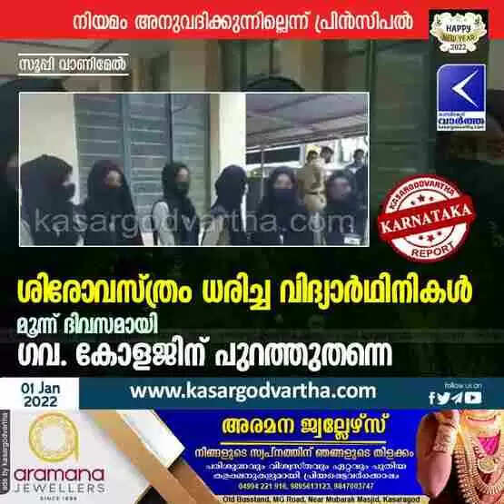 മംഗ്ളുറു: (www.kasargodvartha.com 01.01.2022) ഉഡുപ്പി ടൗണിലെ ഗവ. പ്രി-യൂനിവേഴ്സിറ്റി വനിത കോളജിൽ (പിയു) ശിരോവസ്ത്രം ധരിച്ചെത്തിയ ആറ് വിദ്യാർഥിനികളെ ക്ലാസിൽ കയറ്റുന്നില്ലെന്ന് പരാതി. മൂന്ന് ദിവസമായി ഈ കുട്ടികൾ പുറത്താണ്. എന്ന് തല മറക്കാതെ വരുന്നോ അന്നേ ക്ലാസിൽ കയറ്റൂവെന്നാണ് കോളജ് അധികൃതരുടെ നിലപാടെന്നാണ് ആരോപണം.