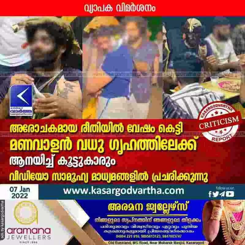 ഉപ്പള: (www.kasargodvartha.com 07.01.2022) അരോചകമായ രീതിയിൽ വേഷം കെട്ടി മണവാളൻ വധു ഗൃഹത്തിലേക്ക് പോവുന്നതിന്റെ ദൃശ്യങ്ങൾ സാമൂഹ്യ മാധ്യമങ്ങളിൽ വ്യാപകമായി പ്രചരിക്കുന്നു. വൻ വിമർശനമാണ് വിവിധ കോണുകളിൽ നിന്ന് ഇതിനെതിരെ ഉയരുന്നത്.