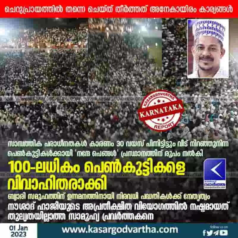 Naushad Haji | സാമ്പത്തിക പരാധീനതകള് കാരണം 30 വയസ് പിന്നിട്ടിട്ടും വീട് നിറഞ്ഞുനിന്ന പെണ്കുട്ടികള്ക്കായി 'നന്ദേ പെങ്ങള്' പ്രസ്ഥാനത്തിന് രൂപം നല്കി; 100-ലധികം പെണ്കുട്ടികളെ വിവാഹിതരാക്കി; ബ്യാരി സമൂഹത്തിന് ഉന്നമനത്തിനായി നിരവധി പദ്ധതികള്ക്ക് നേതൃത്വം; നൗശാദ് ഹാജിയുടെ അപ്രതീക്ഷിത വിയോഗത്തില് നഷ്ടമായത് തുല്യതയില്ലാത്ത സാമൂഹ്യ പ്രവര്ത്തകനെ