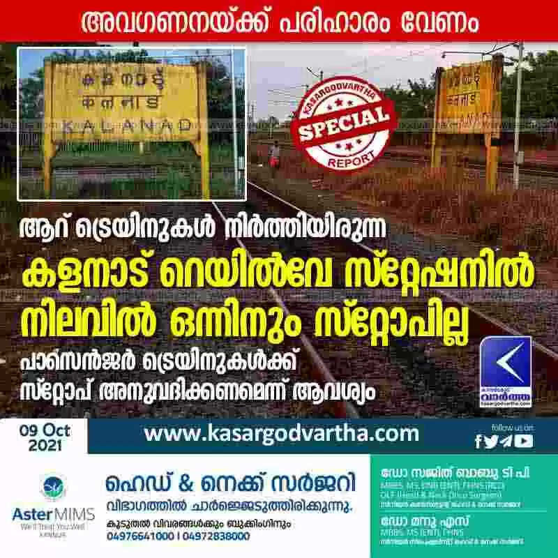 ആറ് ട്രെയിനുകൾ നിർത്തിയിരുന്ന കളനാട് റെയിൽവേ സ്റ്റേഷനിൽ നിലവിൽ ഒന്നിനും സ്റ്റോപില്ല; പാസെൻജർ ട്രെയിനുകൾക്ക് സ്റ്റോപ് അനുവദിക്കണമെന്ന് ആവശ്യം