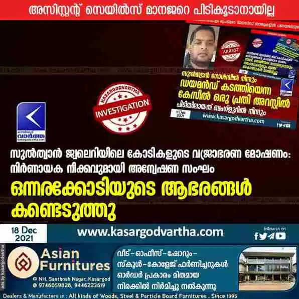 സുൽത്വാൻ ജ്വലെറിയിലെ കോടികളുടെ വജ്രാഭരണ മോഷണം; നിർണായക നീക്കവുമായി അന്വേഷണ സംഘം; ഒന്നരക്കോടിയുടെ ആഭരങ്ങൾ കണ്ടെടുത്തു; അസിസ്റ്റന്റ് സെയിൽസ് മാനജറെ പിടികൂടാനായില്ല
