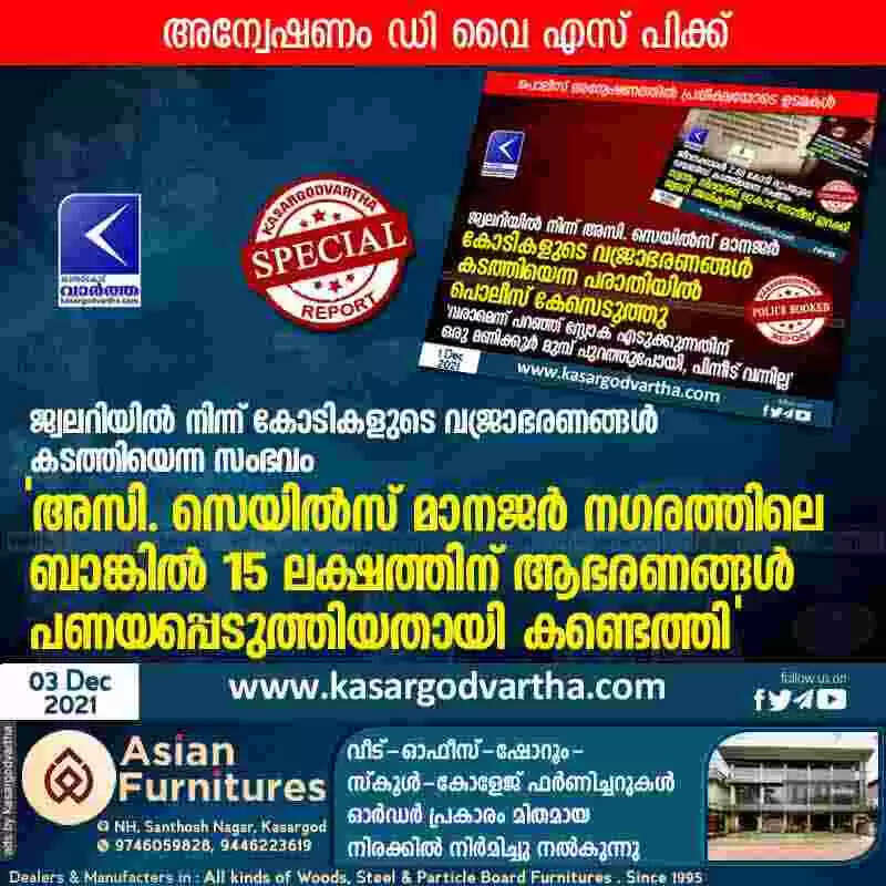 Keywords: News, Kerala, Kasaragod, Top-Headlines, Theft, Complaint, Investigation, Police, Jweller-robbery, DYSP, Case, Mangalore, Bank, State, Karnataka, Mobile Phone, Diamond,  Diamond theft complaint; investigation taken over by the DYSP.
