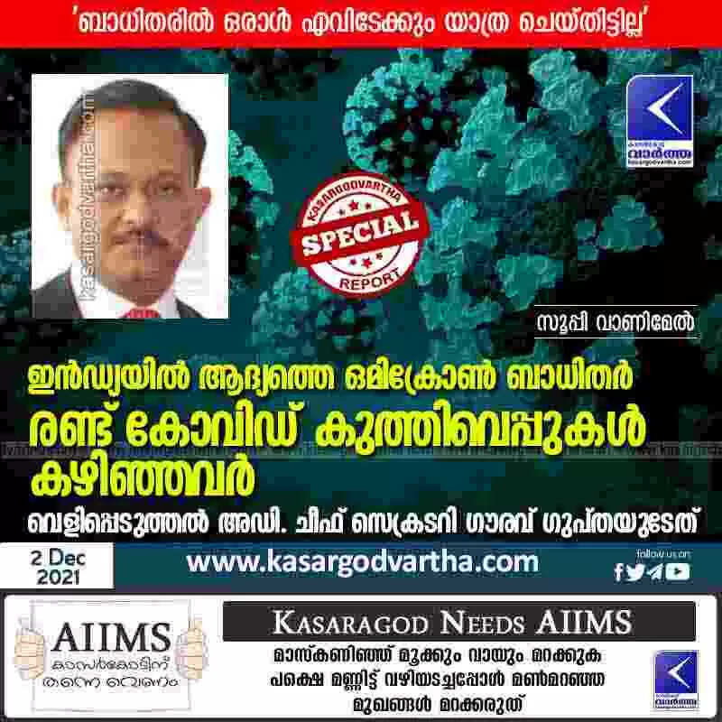 ഇൻഡ്യയിൽ ആദ്യത്തെ ഒമിക്രോൺ ബാധിതർ രണ്ട് കോവിഡ് കുത്തിവെപ്പുകൾ കഴിഞ്ഞവർ; വെളിപ്പെടുത്തൽ അഡി. ചീഫ് സെക്രടറി ഗൗരവ് ഗുപ്തയുടേത്