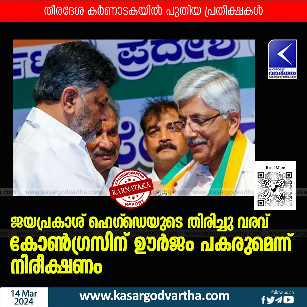 മംഗ്ളുറു: (KasargodVartha) ആളുകൾ നെഞ്ചേറ്റുന്ന, നേതൃതലത്തിൽ അറിവും തന്ത്രവും പകരാനാവുന്ന നേതാവുണ്ടാവുക, അതിന്റെ 'അപകടം' അറിഞ്ഞ അപകർഷതയിൽ അദ്ദേഹത്തെ ചവിട്ടിപ്പുറത്താക്കുക, അതായിരുന്നു ജയപ്രകാശ് ഹെഗ്ഡെ എന്ന ജെ പി ഹെഗ്ഡെയുടെ കാര്യത്തിൽ ഒമ്പത് വർഷം മുമ്പ് കോൺഗ്രസ് ചെയ്തത്. നോടീസ് പോലും നൽകാതെ 2015 ഡിസംബർ 14ന് പാർടിയിൽ നിന്ന് ആറ് വർഷത്തേക്ക് പുറത്താക്കി. കർണാടകയിൽ ഒന്നാം സിദ്ധാരാമയ്യ സർകാർ അധികാരത്തിലിരുന്ന സമയമായിരുന്നു അത്. ദക്ഷിണ കന്നഡ ജില്ലയിലെ എട്ട് നിയമസഭ മണ്ഡലങ്ങളിൽ ഏഴിടത്തും കോൺഗ്രസ് എംഎൽഎമാർ. ബി രമാനാഥ റൈയും യു ടി ഖാദറും മന്ത്രിമാർ. ഉഡുപി ജില്ലയിലെ അഞ്ച് മണ്ഡലങ്ങളിൽ നാലിലും കോൺഗ്രസ് എംഎൽഎമാർ. വിനയകുമാർ സൊറകെ മന്ത്രി.
