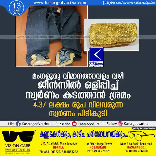 മംഗളൂരു വിമാനത്താവളം വഴി ജീന്സില് ഒളിപ്പിച്ച് സ്വര്ണം കടത്താന് ശ്രമം; 4.37 ലക്ഷം രൂപ വിലവരുന്ന സ്വര്ണം പിടികൂടി