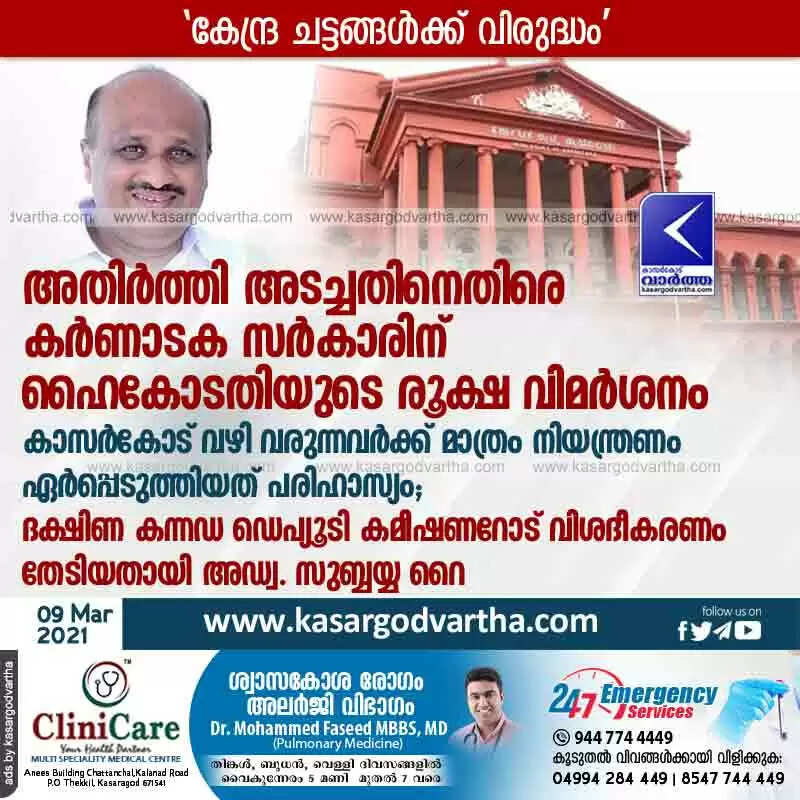 അതിർത്തി അടച്ചതിനെതിരെ കർണാടക സർകാരിന് ഹൈകോടതിയുടെ രൂക്ഷ വിമർശനം; കാസർകോട് വഴി വരുന്നവർക്ക് മാത്രം നിയന്ത്രണം ഏർപ്പെടുത്തിയത് പരിഹാസ്യം; ദക്ഷിണ കന്നഡ ഡെപ്യൂടി കമീഷണറോട് വിശദീകരണം തേടിയതായി അഡ്വ. സുബ്ബയ്യ റൈ