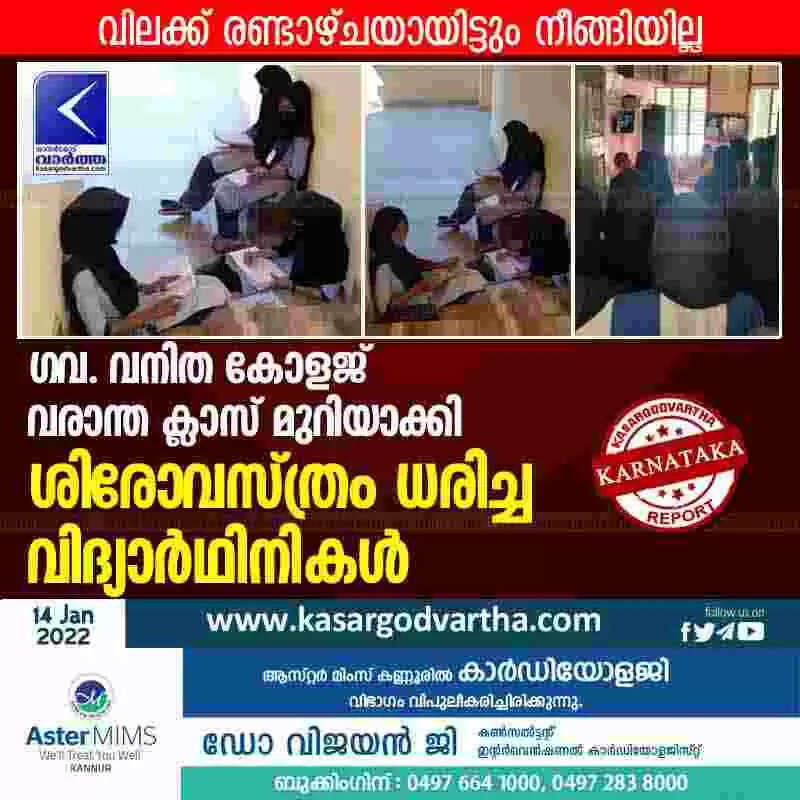 ഗവ. വനിത കോളജ് വരാന്ത ക്ലാസ് മുറിയാക്കി ശിരോവസ്ത്രം ധരിച്ച വിദ്യാർഥിനികൾ
