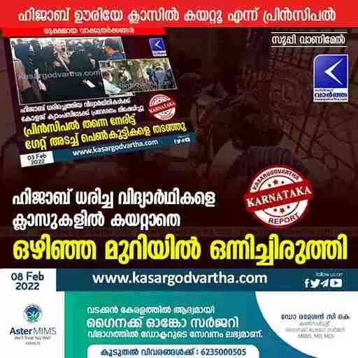 മംഗ്ളുറു: (www.kasargodvartha.com 08.02.2022) ഉഡുപി ജില്ലയിലെ കുന്താപുരം ഗവ. പി യു കോളജിൽ തിങ്കളാഴ്ച ഹിജാബ് ധരിച്ചെത്തിയ വിദ്യാർഥികളെ അവരുടെ വിവിധ ക്ലാസുകളിൽ കടക്കാൻ അനുവദിക്കാതെ അധികൃതർ ഒഴിഞ്ഞ മുറിയിൽ ഒരുമിച്ച് ഇരുത്തി. കഴിഞ്ഞ ദിവസങ്ങളിൽ ഈ കുട്ടികളെ കോളജ് കവാടത്തിൽ തടഞ്ഞിരുന്നു. ഇതേത്തുടർന്നുള്ള പ്രതിഷേധം പൊതുജന ശ്രദ്ധ നേടുകയും ഇടപെടലുണ്ടാവുകയും ചെയ്തു. ഇത് ഒഴിവാക്കാനാണ് കുട്ടികളെ ക്യാംപസിൽ കടത്തിയ ശേഷം ഒതുക്കിയതെന്ന് പ്രിൻസിപൽ പറഞ്ഞു.