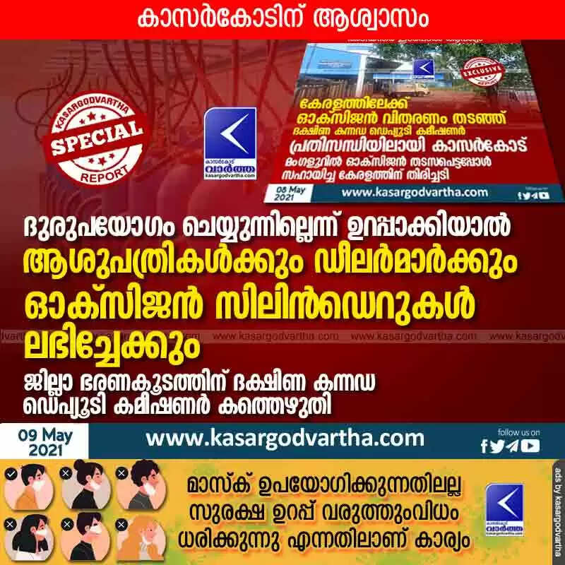 Keywords: Kerala, News, Kasaragod, Karnataka, COVID-19, Corona, Treatment, Hospital, Health, Health-Department, Top-Headlines, Mangalore, Oxygen Cylinders, Hospitals and dealers may receive oxygen cylinders; Dakshina Kannada Deputy Commissioner wrote a letter to the district administration.