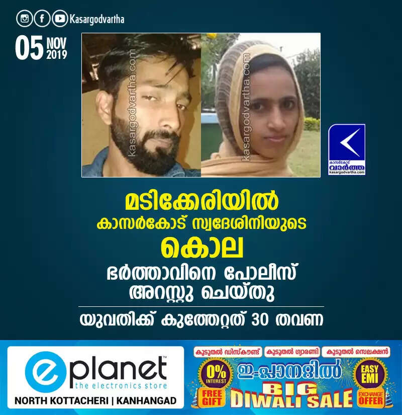 മടിക്കേരിയില്‍ കാസര്‍കോട് സ്വദേശിനിയുടെ കൊല: ഭര്‍ത്താവിനെ പോലീസ് അറസ്റ്റു ചെയ്തു, യുവതിക്ക് കുത്തേറ്റത് 30 തവണ