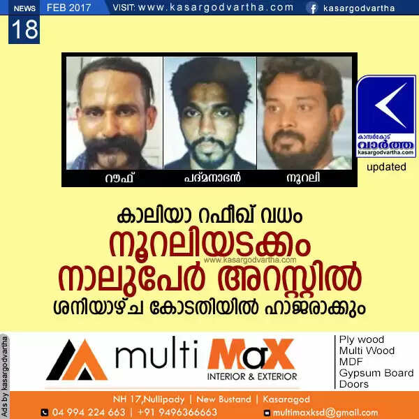 കാലിയാ റഫീഖ് വധം: നൂര് അലിയടക്കം നാലുപേര് അറസ്റ്റില് ശനിയാഴ്ച കോടതിയില് ഹാജരാക്കും