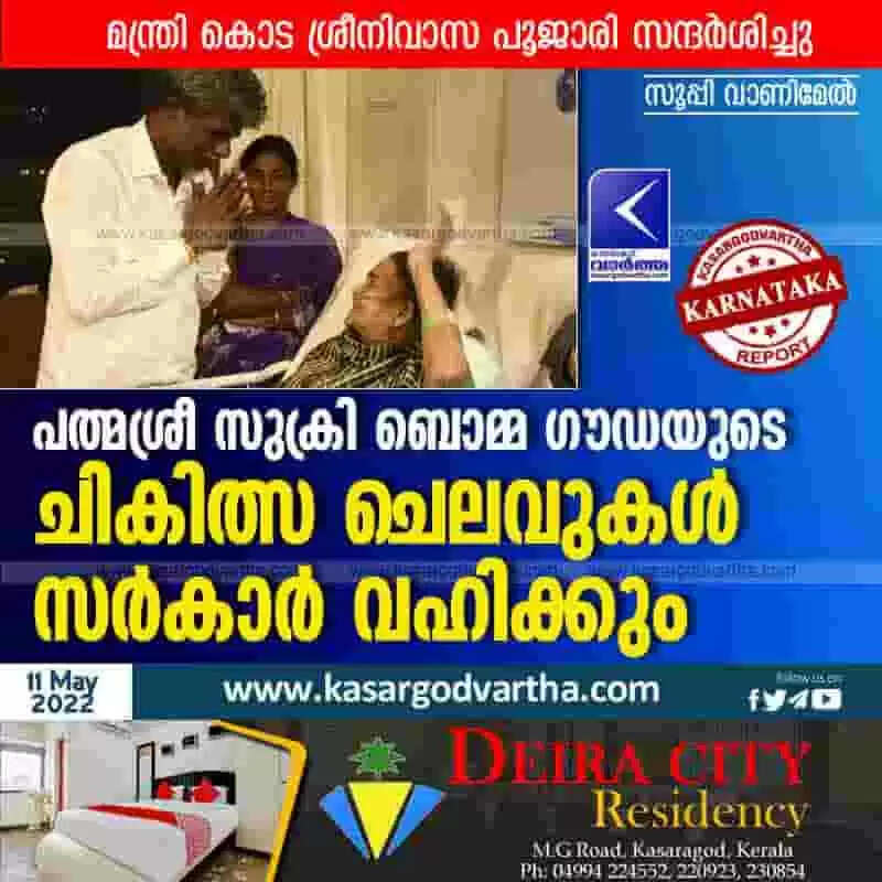 മംഗ്ളുറു: (www.kasargodvrtha.com) പത്മശ്രീ അവാർഡ് ജേതാവായ നാടൻപാട്ട് കലാകാരി സുക്രി ബൊമ്മ ഗൗഡയുടെ (86) ചികിത്സ ചെലവുകൾ കർണാടക സർകാർ വഹിക്കും. മംഗ്ളൂറിൽ സ്വകാര്യ ആശുപത്രിയിൽ അവരെ സന്ദർശിച്ച ശേഷം മന്ത്രി കൊട ശ്രീനിവാസ പൂജാരി മാധ്യമപ്രവർത്തകരെ അറിയിച്ചതാണിത്.