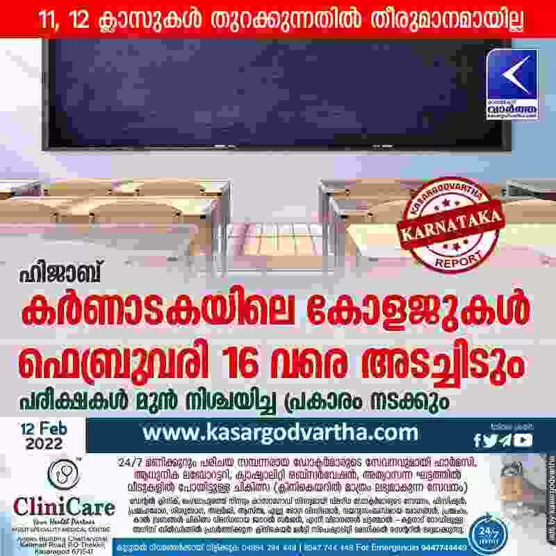 ഹിജാബ്: കർണാടകയിലെ കോളജുകൾ ഫെബ്രുവരി 16 വരെ അടച്ചിടും; പരീക്ഷകൾ മുൻ നിശ്ചയിച്ച പ്രകാരം നടക്കും; 11, 12 ക്ലാസുകൾ തുറക്കുന്നതിൽ തീരുമാനമായില്ല