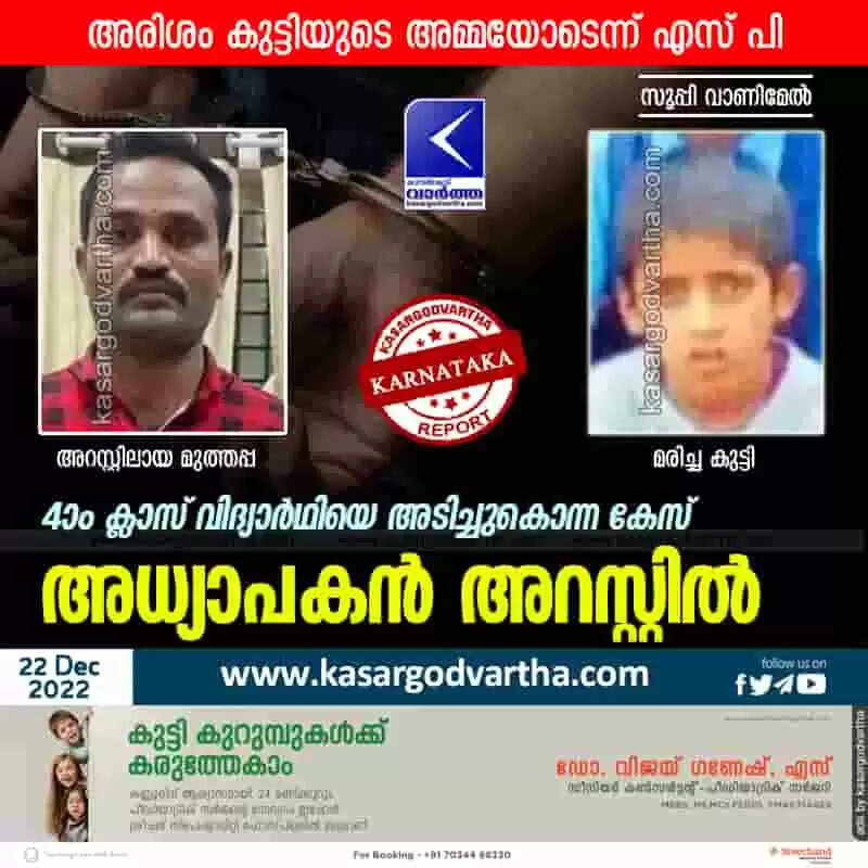 Arrested | 4-ാം ക്ലാസ് വിദ്യാർഥിയെ അടിച്ചുകൊന്ന കേസ്: അധ്യാപകൻ അറസ്റ്റിൽ; അരിശം കുട്ടിയുടെ അമ്മയോടെന്ന് എസ് പി