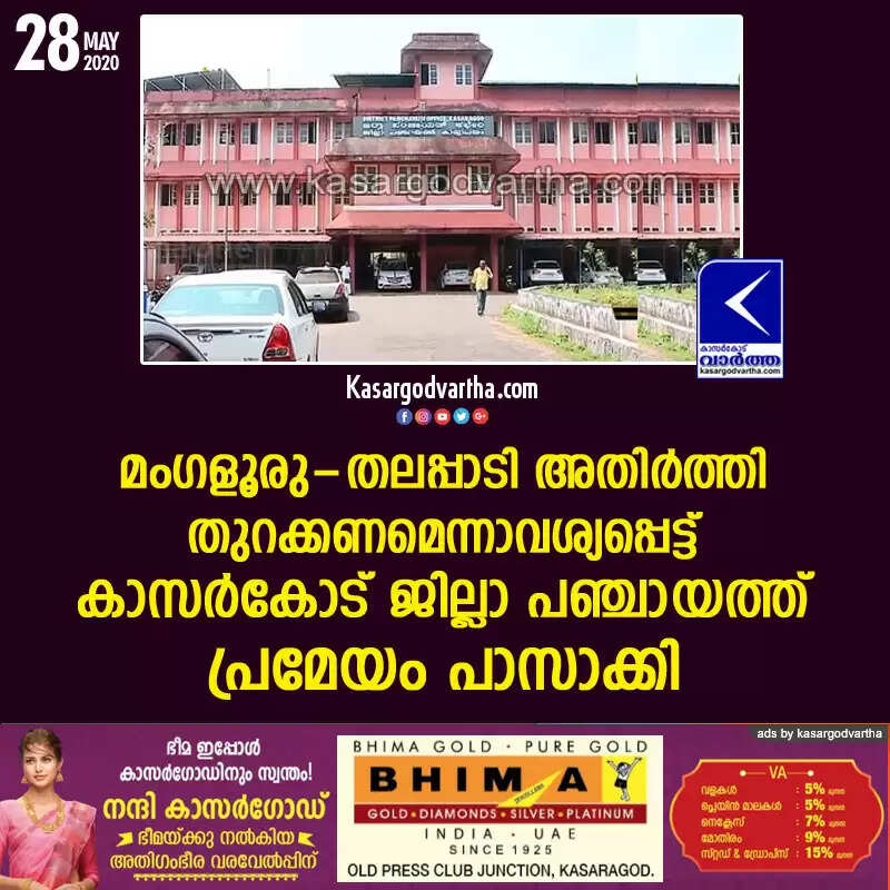 മംഗളൂരു-തലപ്പാടി അതിര്‍ത്തി തുറക്കണമെന്നാവശ്യപ്പെട്ട് കാസര്‍കോട് ജില്ലാ പഞ്ചായത്ത് പ്രമേയം പാസാക്കി
