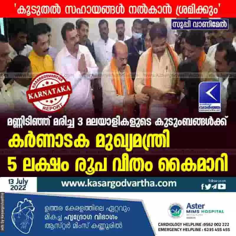 Compensation distributed | മണ്ണിടിഞ്ഞ് മരിച്ച 3 മലയാളികളുടെ കുടുംബങ്ങള്ക്ക് കര്ണാടക മുഖ്യമന്ത്രി 5 ലക്ഷം രൂപ വീതം കൈമാറി