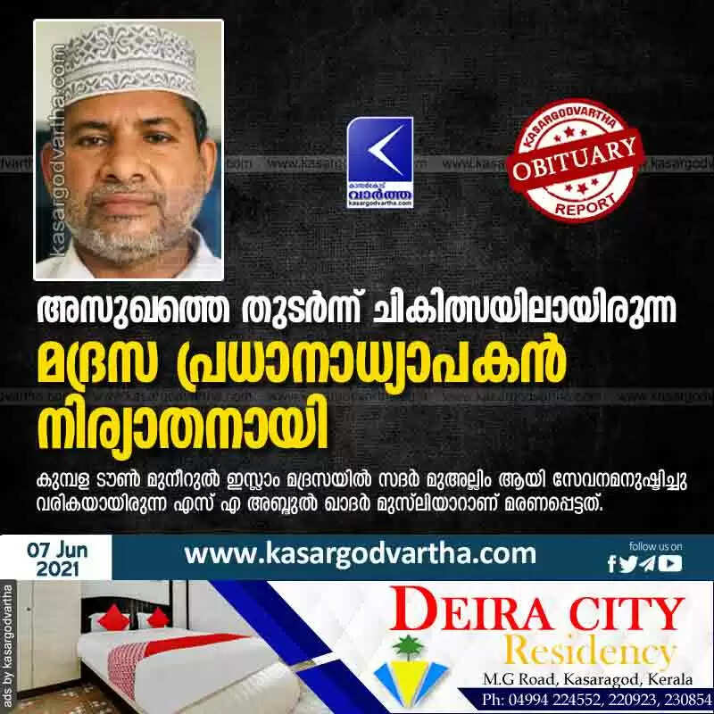 Keywords:  Kumbala, Kerala, Kasaragod, News, Treatment, Death, Obituary, Mangalore, Madrassa headteacher passed away.