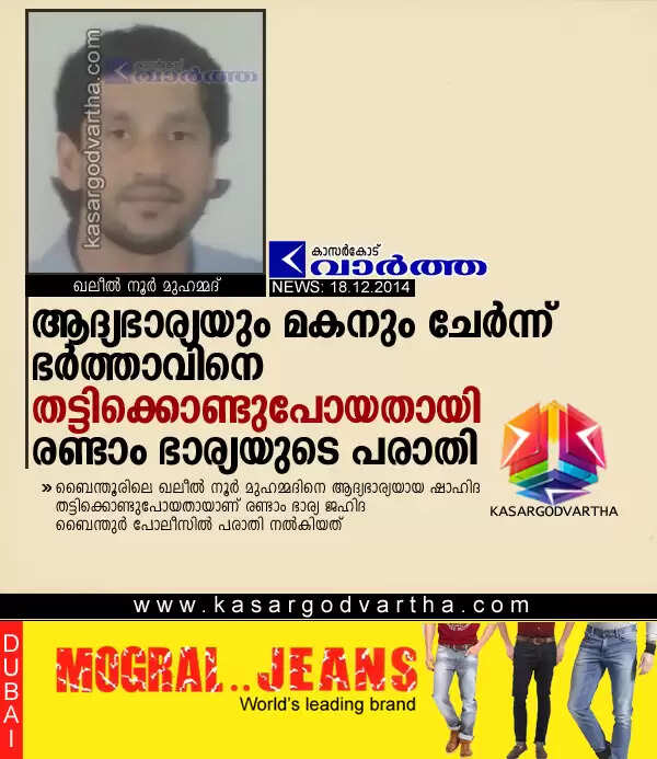 കുന്ദാപൂര്: (www.kasargodvartha.com 18.12.2014) ആദ്യഭാര്യയും മകനും ചേര്ന്ന് ഭര്ത്താവിനെ തട്ടിക്കൊണ്ടുപോയെന്ന് രണ്ടാം ഭാര്യ പോലീസില് പരാതി നല്കി. ബൈന്തൂരിലെ ഖലീല് നൂര് മുഹമ്മദിനെ ആദ്യഭാര്യയായ ഷാഹിദ തട്ടിക്കൊണ്ടുപോയതായാണ് രണ്ടാം ഭാര്യ ജഹിദ ബൈന്തുര് പോലീസിൽ പരാതി നല്കിയത്.