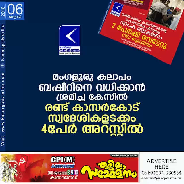 മംഗളൂരു കലാപം: ബഷീറിനെ വധിക്കാന്‍ ശ്രമിച്ച കേസില്‍ രണ്ട് കാസര്‍കോട് സ്വദേശികളടക്കം 4 പേര്‍ അറസ്റ്റില്‍