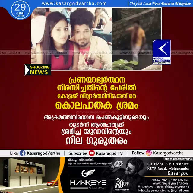 പ്രണയാഭ്യര്‍ത്ഥന നിരസിച്ചതിന്റെ പേരില്‍ കോളജ് വിദ്യാര്‍ത്ഥിനിക്കെതിരെ കൊലപാതക ശ്രമം; അക്രമത്തിനിരയായ പെണ്‍കുട്ടിയുടെയും തുടര്‍ന്ന് ആത്മഹത്യക്ക് ശ്രമിച്ച യുവാവിന്റെയും നില ഗുരുതരം