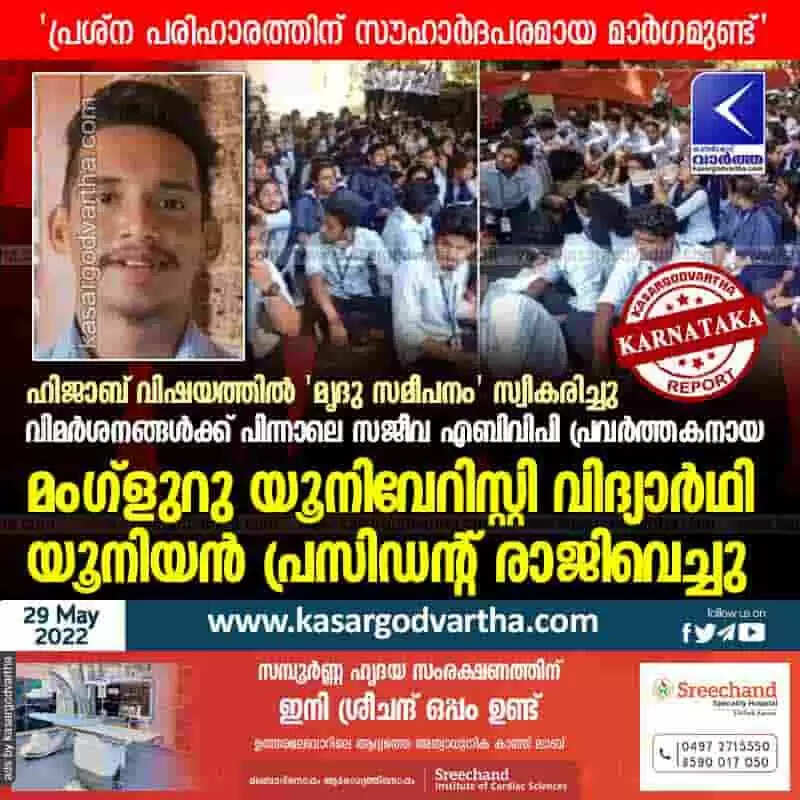 ഹിജാബ് വിഷയത്തിൽ 'മൃദു സമീപനം' സ്വീകരിച്ചു; വിമർശനങ്ങൾക്ക് പിന്നാലെ സജീവ എബിവിപി പ്രവർത്തകനായ മംഗ്ളുറു യൂനിവേറിസ്റ്റി വിദ്യാർഥി യൂനിയൻ പ്രസിഡന്റ് രാജിവെച്ചു