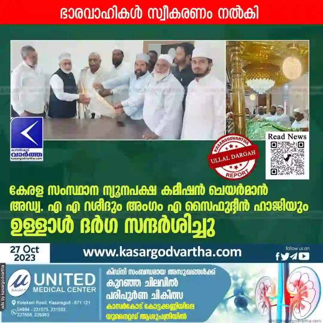 Ullal Dargah | കേരള സംസ്ഥാന ന്യൂനപക്ഷ കമീഷൻ ചെയർമാൻ അഡ്വ. എ എ റശീദും അംഗം എ സൈഫുദ്ദീൻ ഹാജിയും ഉള്ളാൾ ദർഗ സന്ദർശിച്ചു