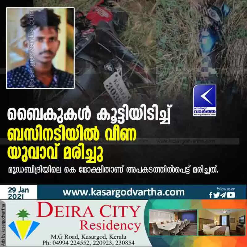 മംഗളൂരു: (www.kasargodvartha.com 29.01.2021) ബൈകുകൾ കൂട്ടിയിടിച്ചതിനെത്തുടർന്ന് ബസിനടിയിൽ തെറിച്ചുവീണ യുവാവ് മരിച്ചു. മൂഡബിദ്രിയിലെ കെ മോക്ഷിതാണ് (19) അപകടത്തില്പെട്ട് മരിച്ചത്.