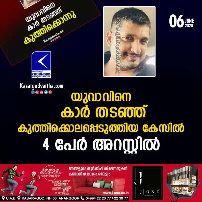 യുവാവിനെ കാര് തടഞ്ഞ് കുത്തിക്കൊലപ്പെടുത്തിയ കേസില് 4 പേര് അറസ്റ്റില്
