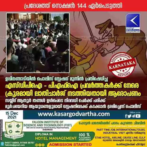 ഉപ്പിനങ്ങാടിയിൽ പൊലീസ് സ്റ്റേഷന് മുന്നിൽ പ്രതിഷേധിച്ച എസ്ഡിപിഐ - പിഎഫ്ഐ പ്രവർത്തകർക്ക് നേരെ ക്രൂരമായി ലാതിചാർജ് നടത്തിയതായി ആരോപണം; സയ്യിദ് ആതൂർ തങ്ങൾ ഉൾപെടെ നിരവധി പേർക്ക് പരിക്ക്; മൂർചയേറിയ ആയുധങ്ങളുമായി കടക്കാൻ ശ്രമിച്ചെന്ന് പൊലീസ്