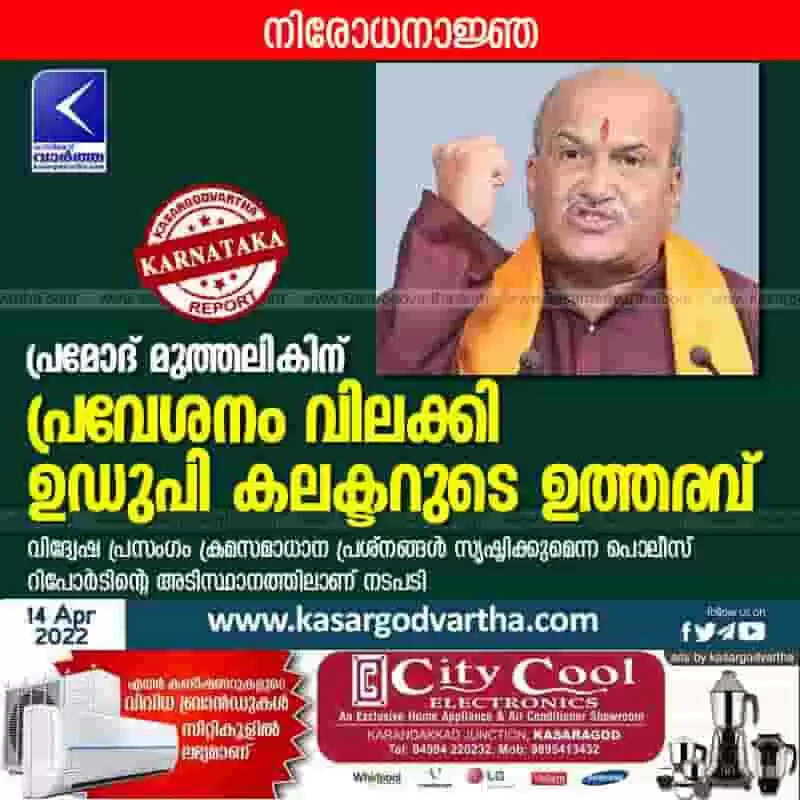 പ്രമോദ് മുത്തലികിന് പ്രവേശനം വിലക്കി ഉഡുപി കലക്ടറുടെ ഉത്തരവ്