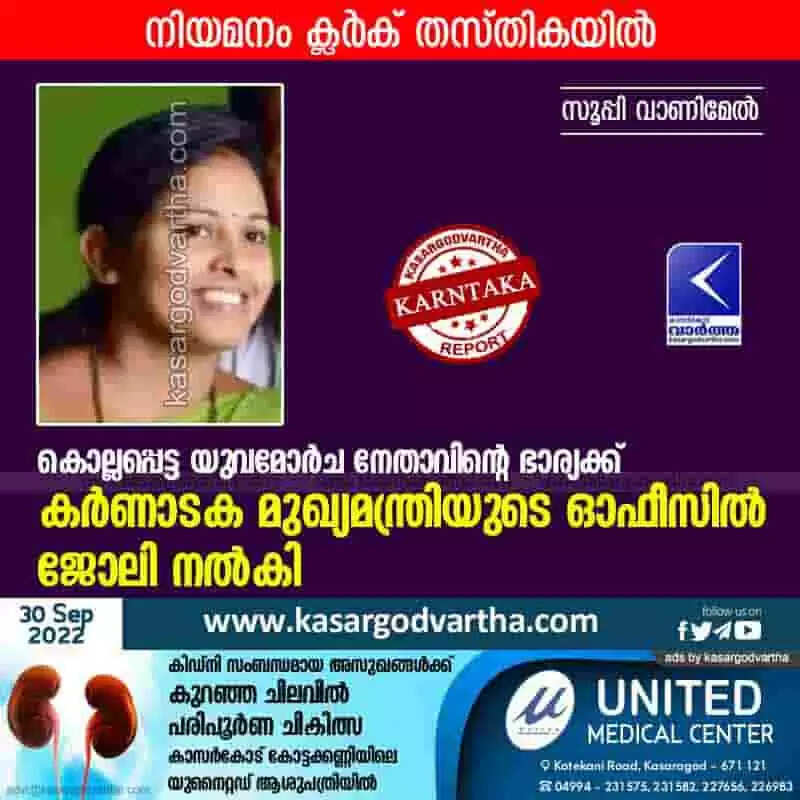 Job | കൊല്ലപ്പെട്ട യുവമോർച നേതാവിന്റെ ഭാര്യക്ക് കർണാടക മുഖ്യമന്ത്രിയുടെ ഓഫീസിൽ ജോലി നൽകി