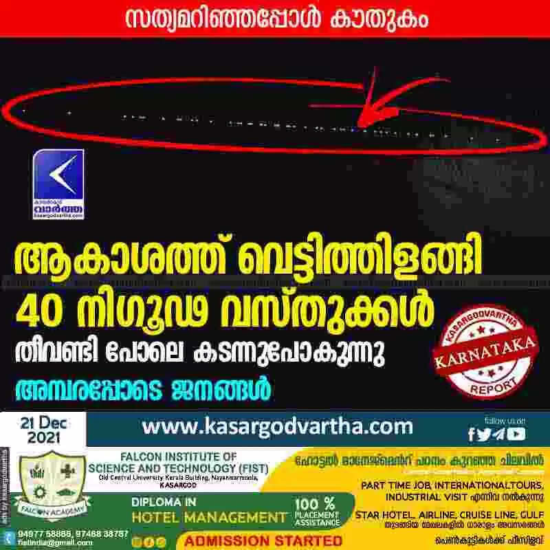 മംഗ്ളുറു: (www.kasargodvartha.com 21.12.2021) തിങ്കളാഴ്ച വൈകുന്നേരം ദക്ഷിണ കന്നഡ, ഉഡുപ്പി ജില്ലകളിലുള്ളവർ ആകാശത്ത് ആ കാഴ്ച കണ്ടു അമ്പരന്നു. മാനത്ത് വെട്ടിത്തിളങ്ങി നിഗൂഢമായ 40 വസ്തുക്കൾ പറക്കുന്നു. എന്താണ് സംഭവിക്കുന്നതെന്നറിയാതെ പലരും കൗതുകത്തോടെ നോക്കി നിന്നു.
