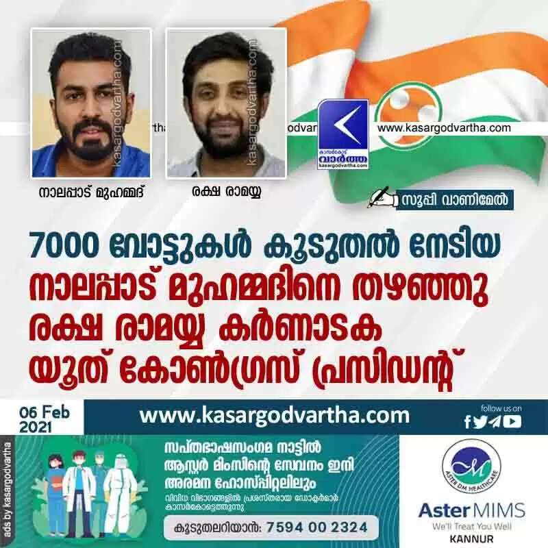 7000 വോട്ടുകൾ കൂടുതൽ നേടിയ നാലപ്പാട് മുഹമ്മദിനെ തഴഞ്ഞു രക്ഷ രാമയ്യ കർണാടക യൂത് കോൺഗ്രസ് പ്രസിഡന്റ്