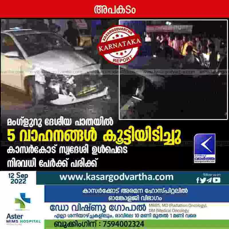 Several injured | മംഗ്ളുറു ദേശീയ പാതയിൽ 5 വാഹനങ്ങൾ കൂട്ടിയിടിച്ചു; കാസർകോട് സ്വദേശി ഉൾപെടെ നിരവധി പേർക്ക് പരിക്ക്