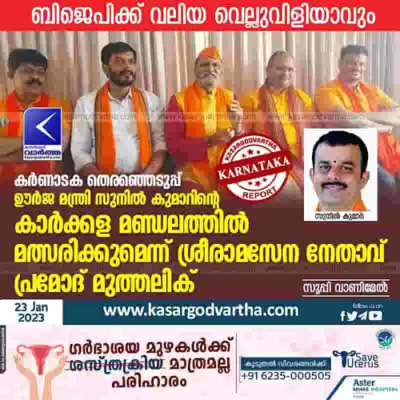 Candidature | കര്ണാടക തെരഞ്ഞെടുപ്പ്: ഊര്ജ മന്ത്രി സുനില്കുമാറിന്റെ കാര്ക്കള മണ്ഡലത്തില് മത്സരിക്കുമെന്ന് ശ്രീരാമസേന നേതാവ് പ്രമോദ് മുത്തലിക്