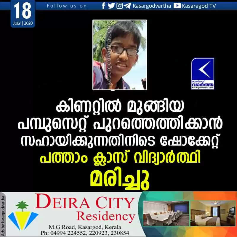 കിണറ്റില് മുങ്ങിയ പമ്പുസെറ്റ് പുറത്തെത്തിക്കാന് സഹായിക്കുന്നതിനിടെ ഷോക്കേറ്റ് പത്താം ക്ലാസ് വിദ്യാര്ത്ഥി മരിച്ചു