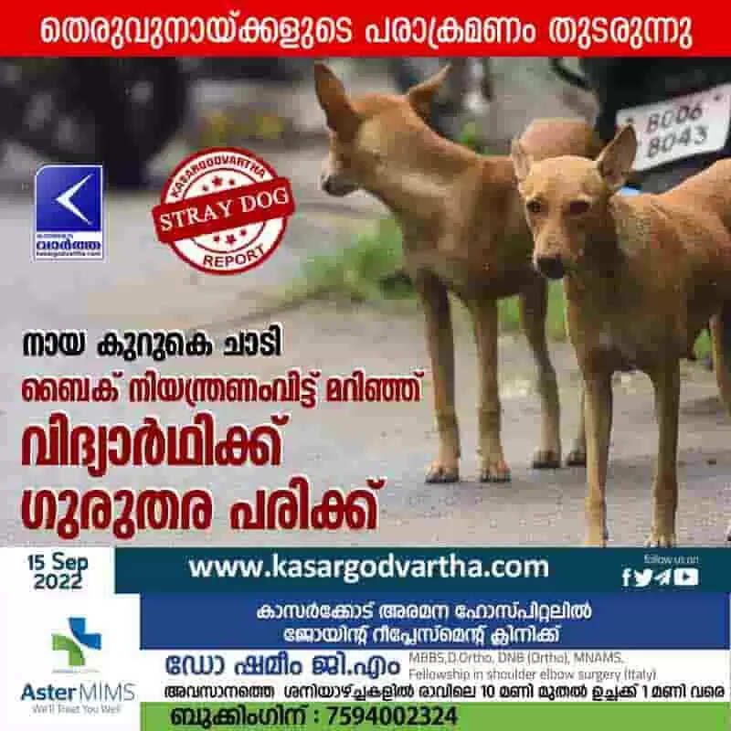 Keywords: Student injured in accident after dog jumped infront of bike, Manjeshwaram, Kerala, Top-Headlines, Student, Street dog, Uppala, Mangalore, Police, Bike, Injured.