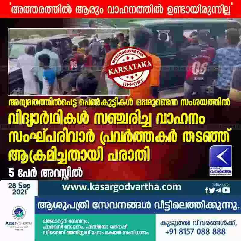 അന്യമതത്തിൽ പെട്ട പെൺകുട്ടികൾ ഒപ്പമുണ്ടെന്ന സംശയത്തിൽ വിദ്യാർഥികൾ സഞ്ചരിച്ച വാഹനം സംഘ്പരിവാർ പ്രവർത്തകർ തടഞ്ഞ് ആക്രമിച്ചതായി പരാതി; 5 പേർ അറസ്റ്റിൽ