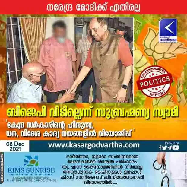 ബിജെപി വിടില്ലെന്ന് സുബ്രഹ്മണ്യ സ്വാമി; 'കേന്ദ്ര സർകാരിന്റെ ഹിന്ദുത്വം, ധന, വിദേശ കാര്യ നയങ്ങളിൽ വിയോജിപ്പുണ്ട്'