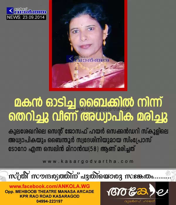 മംഗലാപുരം: (www.kasargodvartha.com 23.09.2014) മകന് ഓടിച്ച ബൈക്കില് നിന്നു തെറിച്ചു വീണ് അധ്യാപിക മരിച്ചു. കുലശേഖറിലെ സെന്റ് ജോസഫ് ഹയര് സെക്കന്ഡറി സ്കൂളിലെ അധ്യാപികയും ബൈന്തൂര് സ്വദേശിനിയുമായ സിംപ്രോസ് ടോറോ എന്ന സെലിന് മിറാന്ഡ(58) ആണ് മരിച്ചത്.